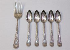 6 Pcs Antique Crown Silverplate Etched Fruit Spoons Cold Meat Serving Fork Set