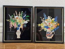 VINTAGE FOLK ART TINSEL REVERSE GLASS FLORAL PAINTINGS SET OF 2 FOIL ART
