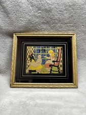 Vintage Art Of 2 Girls Sewing Wooden Frame And Glass Mirror 6.5”x5.5” antique