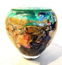 Vintage Signed Novaro Glass Vase Overlay Multicolor Turquoise and Gold Fish 1997