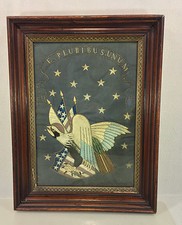 Antique Embroidery of Eagle and Stars E Pluribus Unum In Wood Frame Under Glass