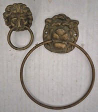 Two Antique vintage brass Metal Lion Head Towel ring holder set