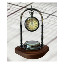 Engraved Vintage Desk Clock with Compass, Antique Brass Finish