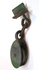 Old 1930s 5/8 Inch Wide 1+ lb Antique Iron Pulley 4.5" Tall w Hanging Loop Chain