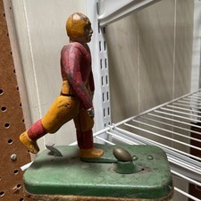Football Kicker Vintage 1920's Cast Iron Toy. Pull leg back, he kicks football.
