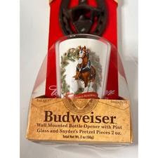 BUDWEISER ~ WALL MOUNTED BOTTLE OPENER WITH PINT GLASS & PRETZELS ~ NEW