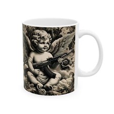Ceramic Coffee Mug Cherub Gothic Art AK47 Illustration Vintage Style