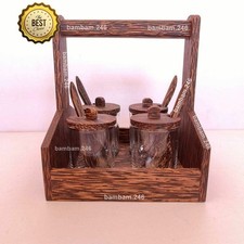 Thai Condiment Jar Set – 4pcs Palm Wood & Glass Spice Container with Spoons