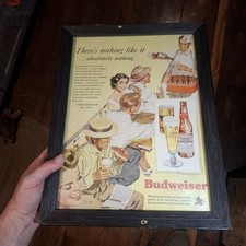 Vintage 1950s Budweiser Beer Baseball Advertisement Picture Framed Glass