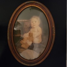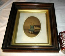 antique adorable BABY PORTRAIT PHOTO enhanced CONCAVE GLASS WOOD FRAME 15.25"