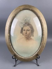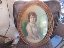 Antique 1900 Oval Convex Glass Framed Portrait Of A Young Girl