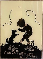 Vtg Antique Silhouette Reverse Painted Convex Glass Lady Talking To Pail Fetcher