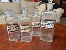 4 Antique Apothecary Bottles Glass Reverse Labels Pharmacy