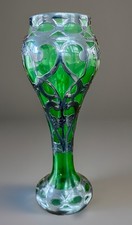Antique Art Nouveau Green Glass Vase Silver Overlay Bohemian c1900