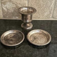 Vtg Sterling Silver Toothpick Holder Bud Vase Mini Urn Cup & 2 dish saucers 3"