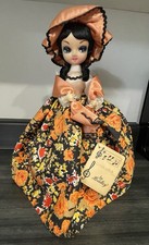 VINTAGE 1960s BRADLEY MUSIC BOX BIG EYED SOUTHERN BELLE DOLL PLAYS PAPER MACHE