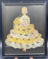 Vintage Antique 1920s Framed Ribbon Art Paper Doll Picture W/ Yellow Dress