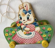 Vintage 1960s Fisher Price Wood Easter Girl Bunny Rabbit Pull Toy Wheels 310