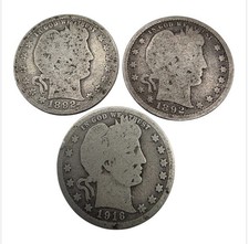 3 - Barber Silver Quarters 1892 (x2) & 1916 – 90% Silver – 3 Coin Lot