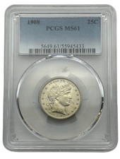 1908 25c Barber Quarter, MS61 PCGS, Strong Detail, Early Silver Coin.