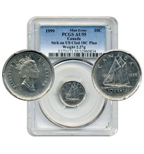 1999 Canada 10 Cents, MINT ERROR, Struck on Foreign Planchet - PCGS AU53