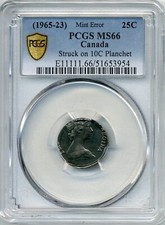 1968-1989 Canada 25 Cent MINT ERROR, Struck on 10 Cent Planchet - PCGS MS 66