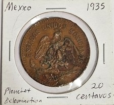 Mexico 20 Centavos 1935 Bronze Coin KM #437 - PLANCHET DELAMINATION ERROR!