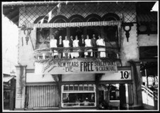 people standing on a balcony above a sign advertising The Boosters - Old Photo