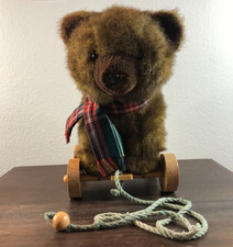 Vintage Applause Nostalgic Bear Teddy Pull Toy on Wood Wheels Plush Animal 1986