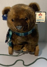 Vintage Applause Pull Behind Bear Plush Toy Wood Wheels Plaid Scarf 1986 Brown