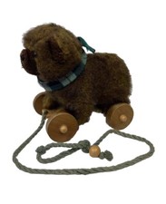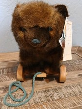 Vtg 1986 Applause Bear Pull Toy Plush 7”Brown Wood Wheels Original PullRope Read