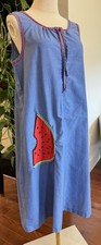 Sz M Vintage 1960s Mid Century Cotton Chambray Embroidered Dress Smock Mumu Zip