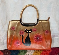 OOAK Hand Painted Mid Century Modern Black Cat Purse - Orange Metallic Gold