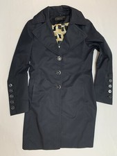 Tahari Black Cotton Blend Trench Coat Unique Buttons Tan Mid Century Liner Sz M