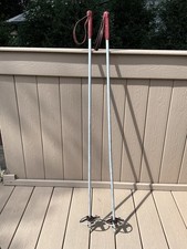 Antique Vintage Aluminum Ski Pole Red Leather Handles Straps Skiing Poles
