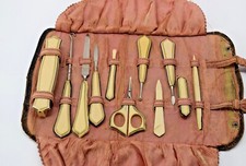 Antique Leather Roll Up Case Travel Manicure Set Celluloid Pyralin Ivorine Class