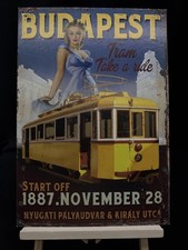 The image is a nostalgic advertising sign dedicated to the history of Budapest t