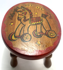 Vintage Childs Wood Stool Hand Painted with Wheeled Horse "Please Sit on Me"