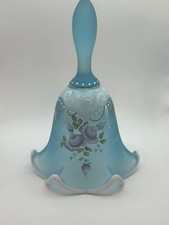 Vintage Fenton Art Blue Satin Glass Cabbage Rose Hand Painted Bell