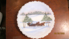 Fenton Custard glass Plate 1980 Winter Horse drawn Sleigh signed Gloria Finn 8”