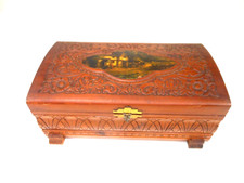 Vintage Carved Wood Music Box Scenic Footed w Mirror Brass Handles