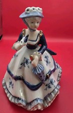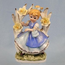 Vintage Girl Figurine Music Box Korea Ceramic Blue Dress Daffodils Spring