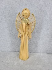 Handmade Straw Rattan Angel Christmas Ornament Wooden Face Mid-Century 9"