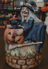 Vintage Ceramic Halloween Witch Jack-O-Lantern Black Cat Music Box Working