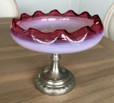 Antique Glass Compote Bowl Attached Metal Base - 8” Cranberry Opalescent