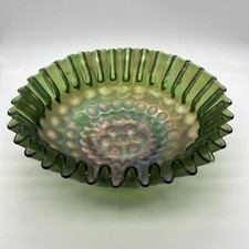 Fenton Stippled Coin Dot Bowl Green Carnival Glass Crimped Edge