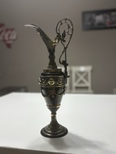 Antique Brass Pitcher Urn Ornate Rare 16.5" Tall Detailed Faces Black Wood Base