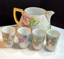 Vintage Hand Painted Lemonade Cider Pitcher Fruits And Flowers With 4 Glasses
