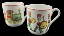 2 Vintage Vista Alegre Christmas Magic Mugs Cups Porcelain Toy Train & Soldiers