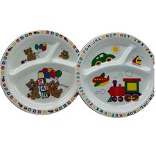 2 Vtg. Child's plastic melamine divided kid dish plate Teddy Bears & Train 8.5in